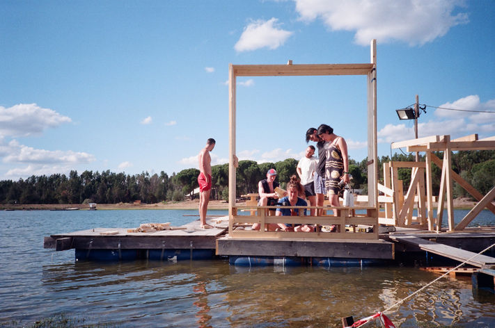 A floating lake house in Crato, Portugal connecting two sites on opposite sides of the lake. The main structure was anchored in the centre of the lake and two smaller rafts acted as ferries to the shore.